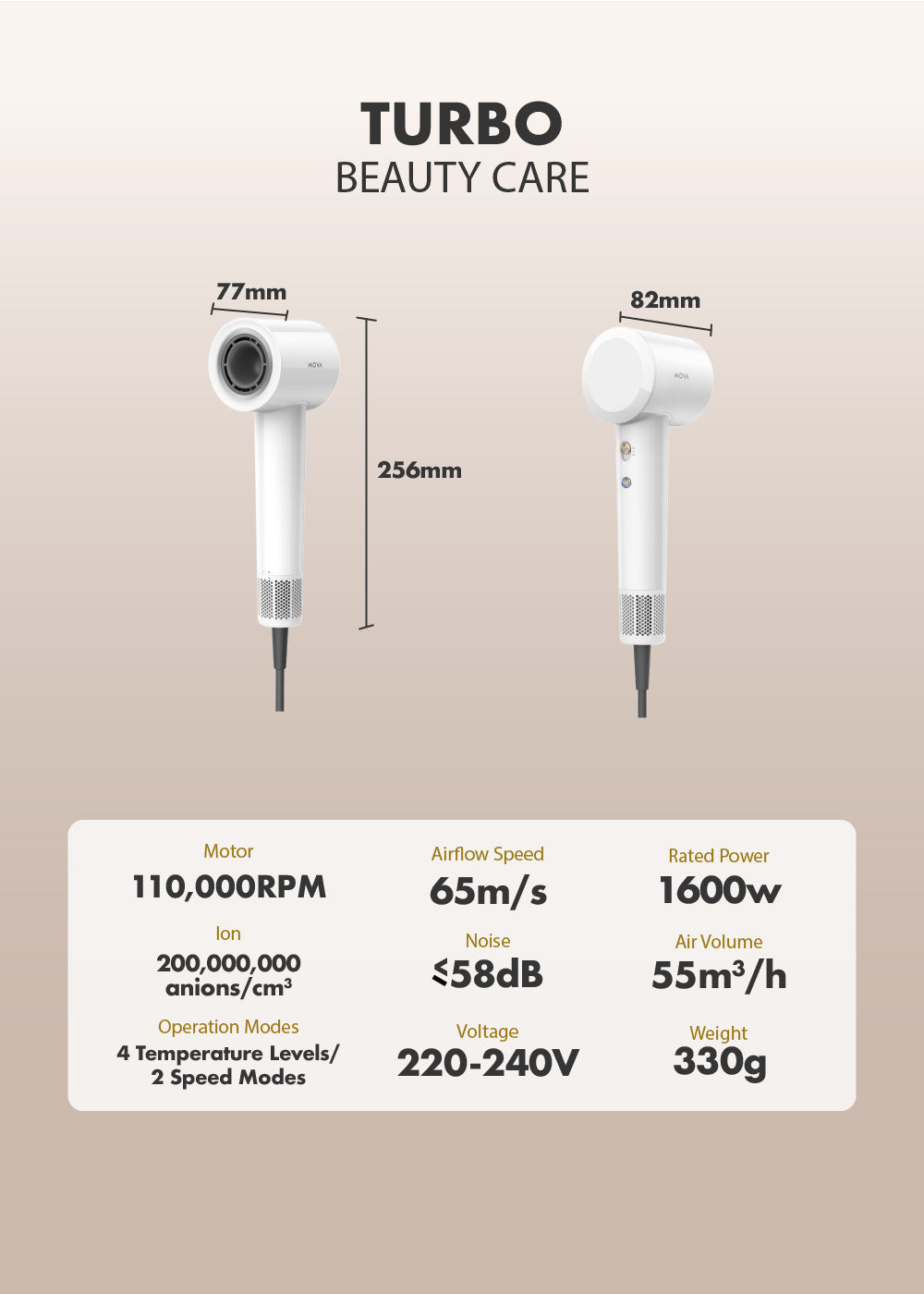 Thanks to its 110,000 RPM motor and powerful airflow of 55 mยณ/h, the MOVA Turbo can dry your hair in as fast as 40 seconds for short hair or 3โ5 minutes for longer styles โ cutting your drying time dramatically compared to traditional dryers!
