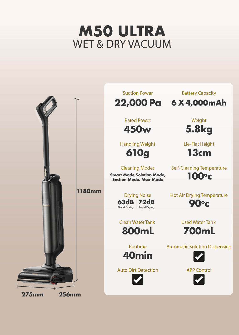 Most vacuums offer 10,000โ18,000Pa. The M50 Ultra delivers 22,000Pa suction + 20N downward pressure, tackling even the toughest stains.