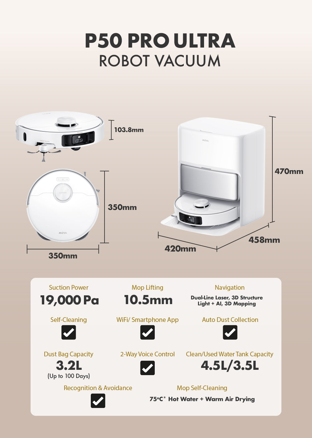 Enjoy automated dustbin emptying for up to 75 days and dock self-cleaning. With the help of a 3.5L used water tank and a 4L clean water tank, the robot vacuum autonomously cleans its mop pads with 75℃ hot water and dries with hot air, keeping your hands free.