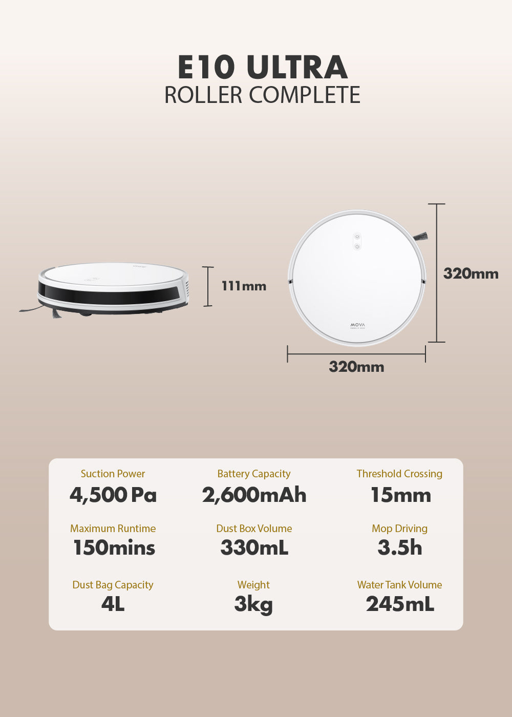 E10'sĀ compactĀ 7.6cmĀ heightĀ andĀ 32.5cmĀ diameter*Ā ensureĀ easyĀ maneuverability,Ā effortlesslyĀ reachingĀ tightĀ cornersĀ andĀ slidingĀ underĀ furniture.Ā ItsĀ flexibleĀ designĀ adaptsĀ toĀ variousĀ spaces,Ā cleaningĀ hard-to-reachĀ areasĀ likeĀ underchairsĀ andĀ insideĀ wardrobes.