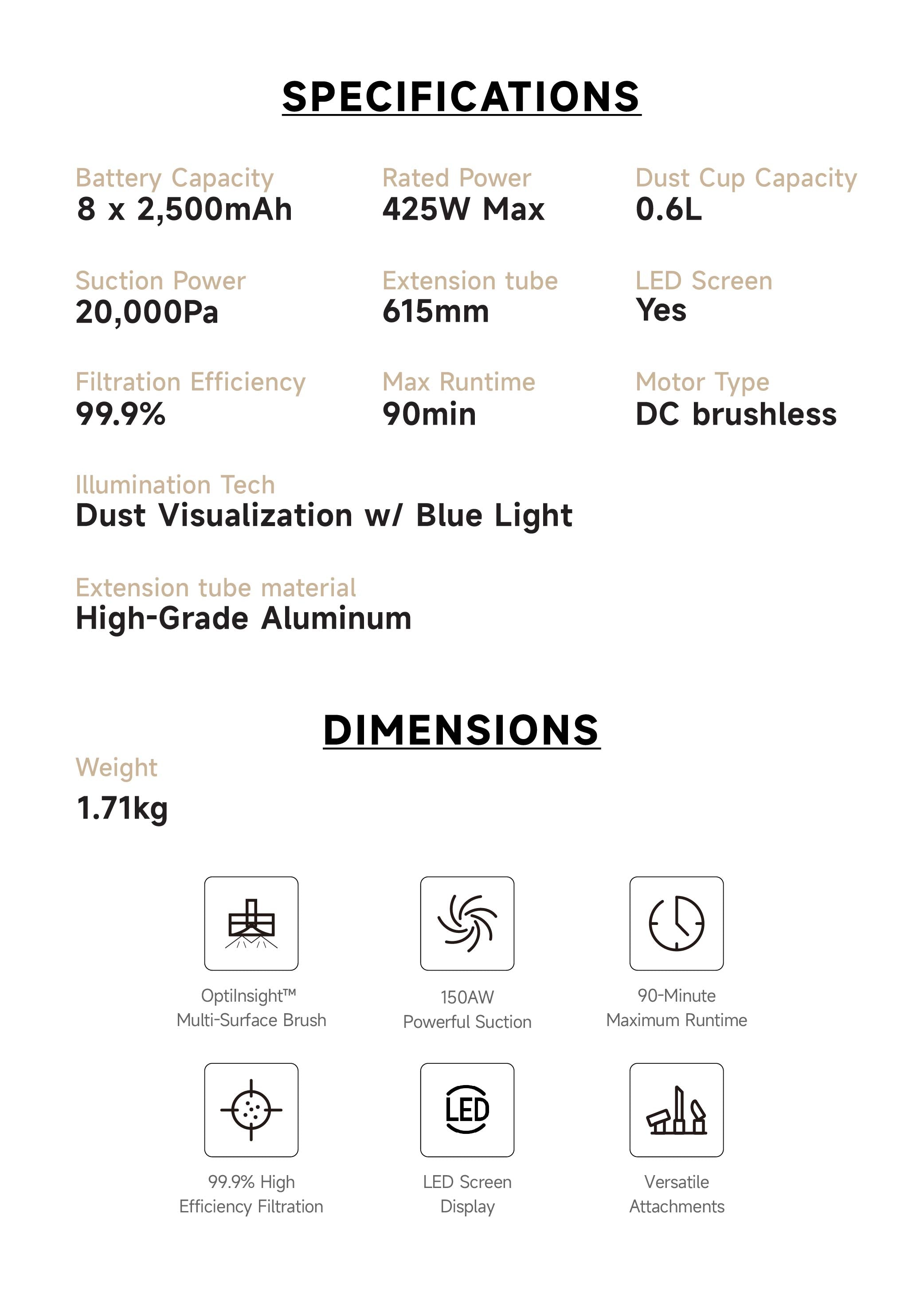 The S4 Detect delivers powerful suction up to 20,000Pa with a high-speed brushless motor, making it perfect for picking up hair, dust, dirt, and debris across all surfaces.