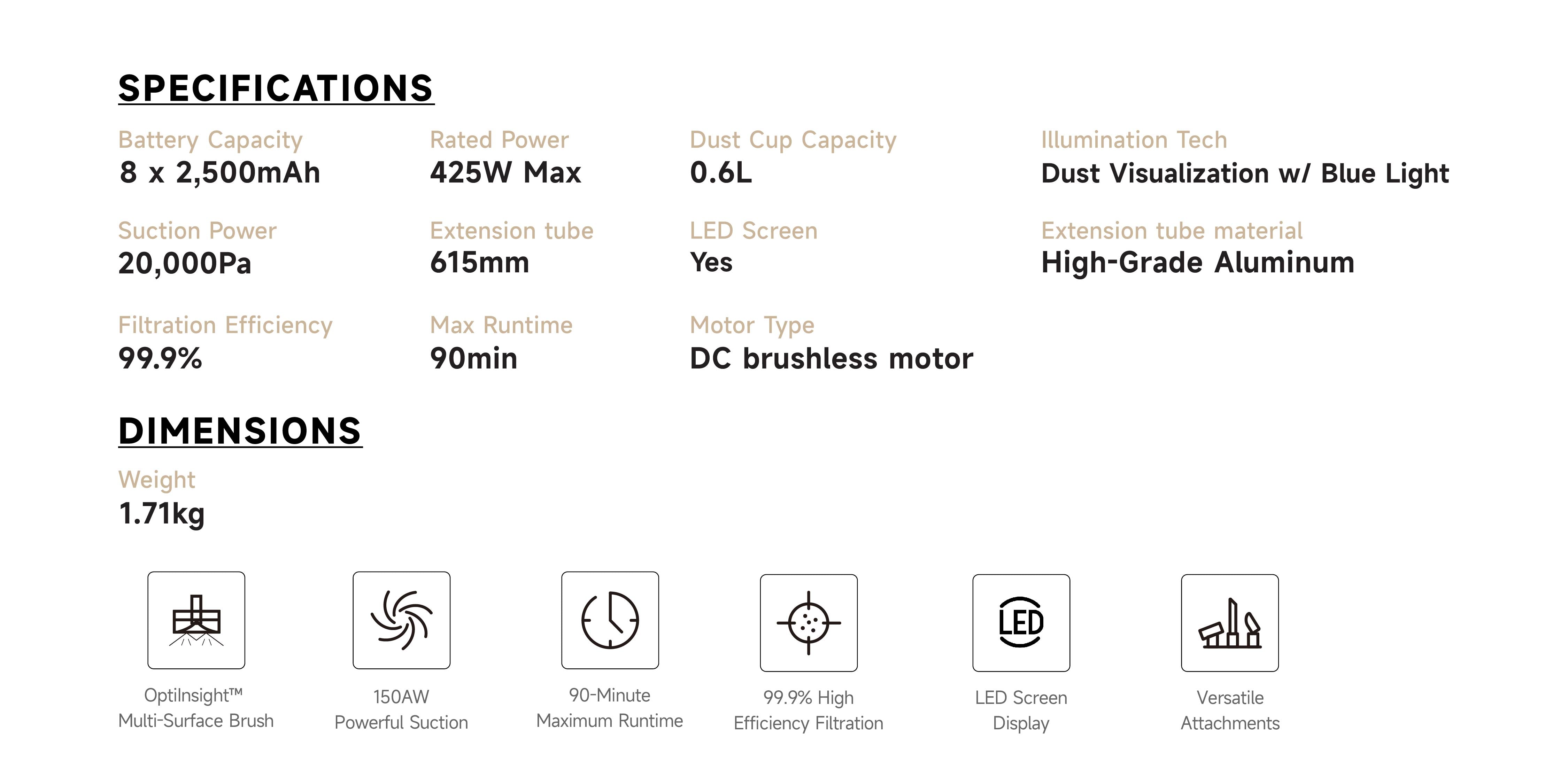 With its powerful 8 x 2,500mAh* battery pack, Its flexible runtime ensures that it can accommodate different cleaning needs.