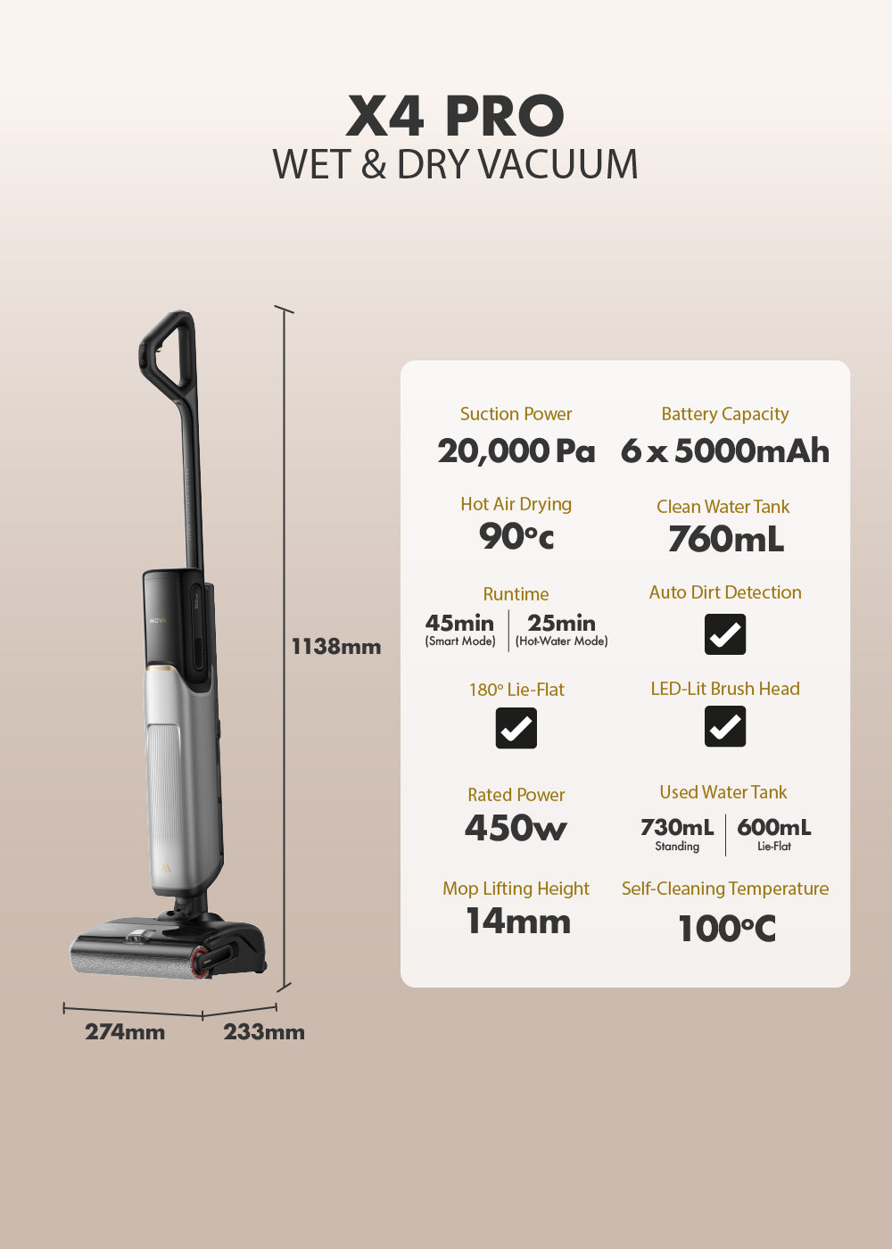 The Lift-Free & Push-In base station, X4 Pro provides smooth cleaning operations from beginning to end.