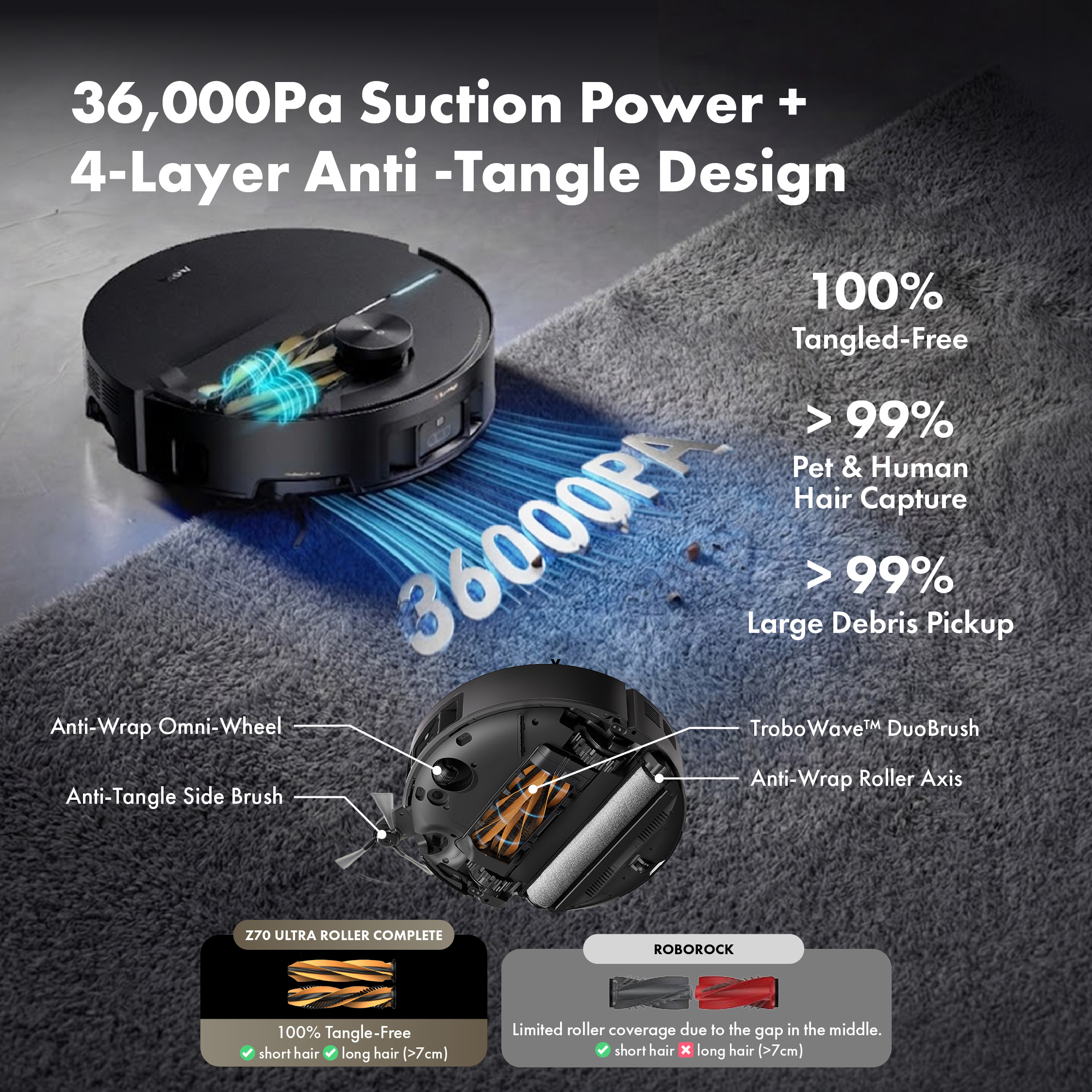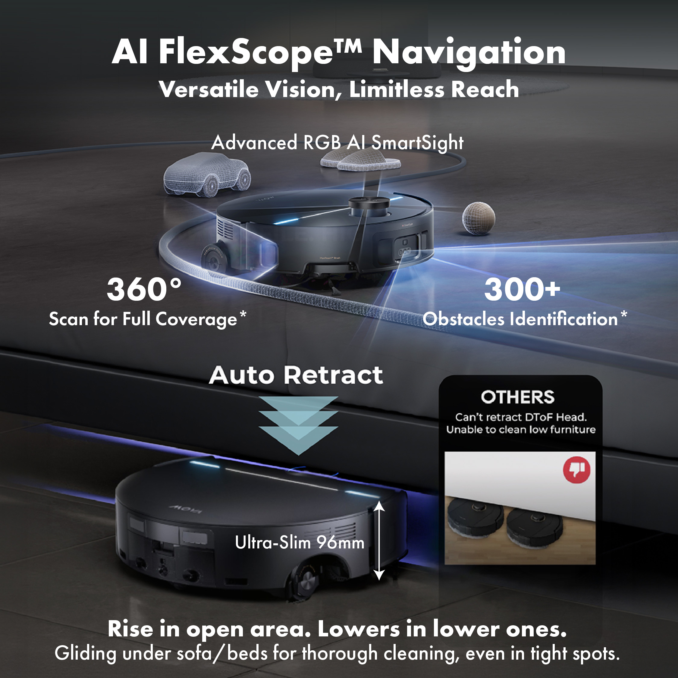Advanced roller mop with world-first 9cm obstacle climbing and 36,000Pa suction delivers uninterrupted cleaning on all surfaces. Next-gen AI recognizes 300+ obstacles, while instant self-washing keeps the mop fresh.