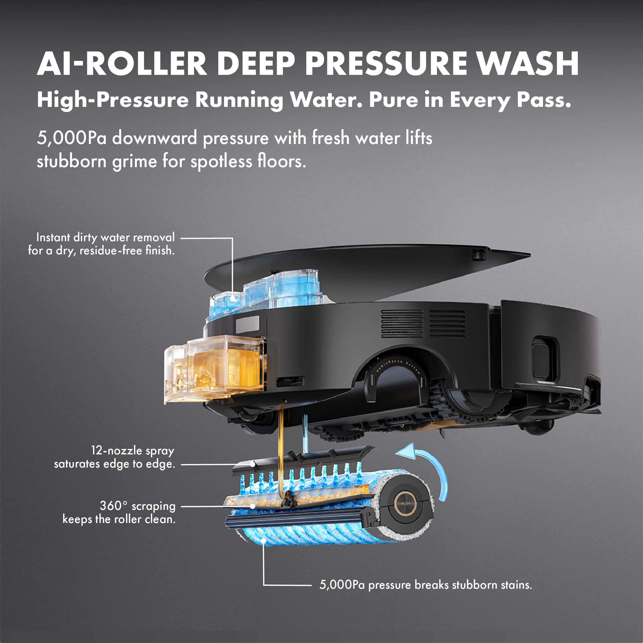 5,000Pa*High-Pressure Running Water. 360° continuous scraping always keeps the roller clean. Dirty water is removed instantly for a dry, streak-free floor.